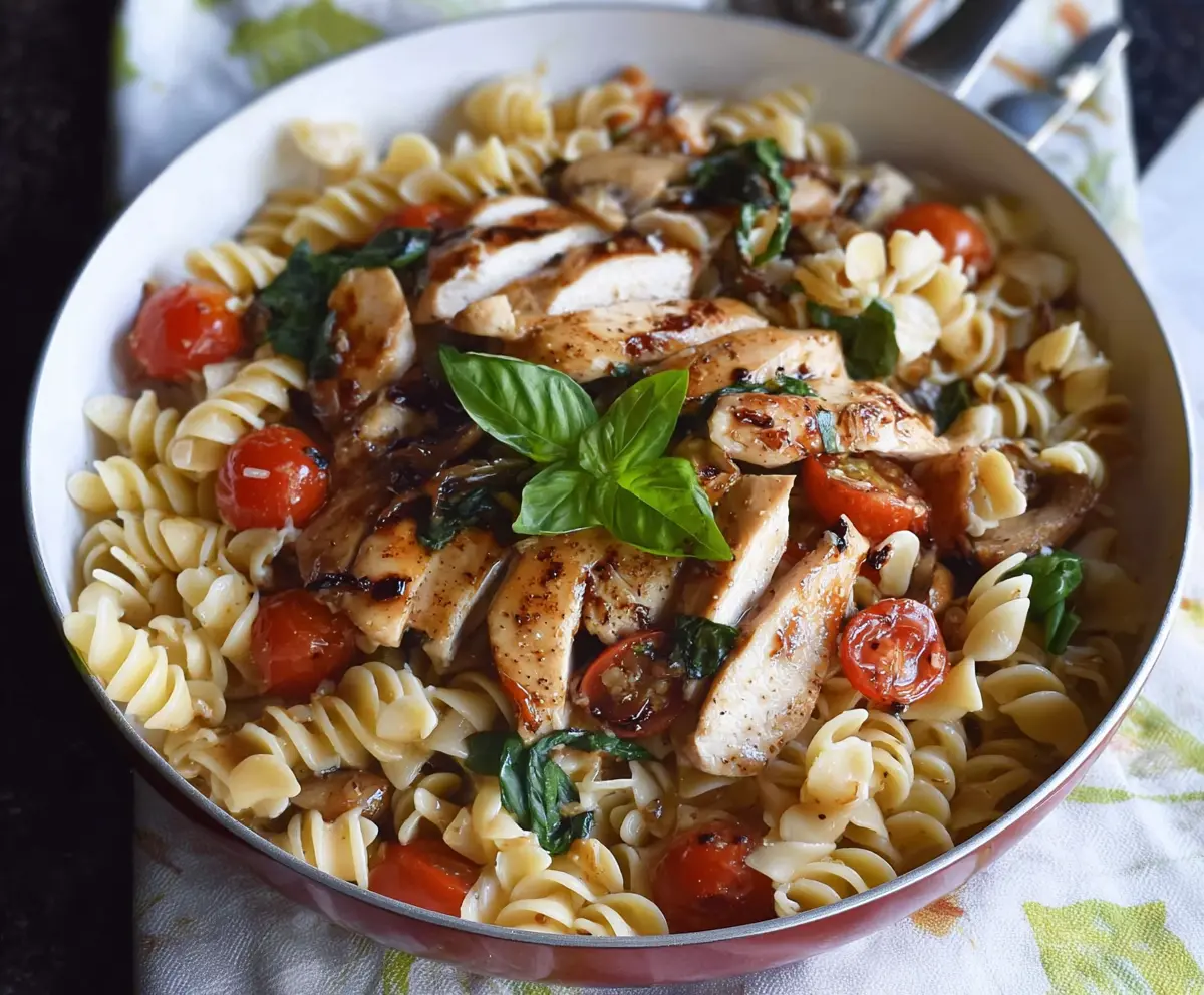This Balsamic Chicken Pasta is a tasty mix of juicy chicken, fresh veggies, and pasta, all tossed in a sweet and tangy balsamic sauce. Perfect for dinner or a quick lunch!