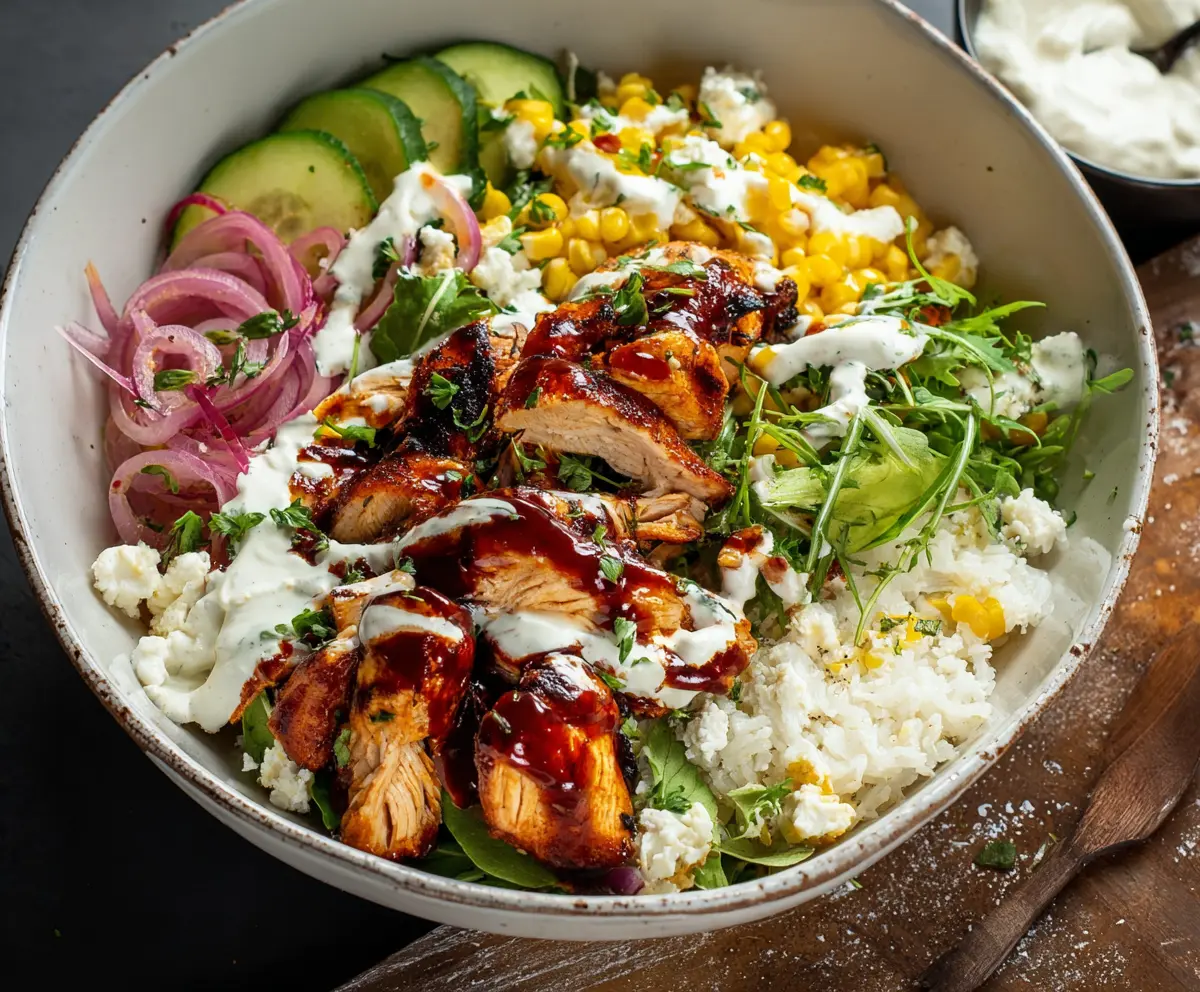 Now it’s time to layer! Place the BBQ chicken on one side of the bowl. For a colorful and tasty presentation, add the sliced avocado, quartered tomatoes, sliced red onions, shredded cheddar cheese, and crumbled feta cheese. Don’t forget to add dollops of cottage cheese for that creamy goodness!