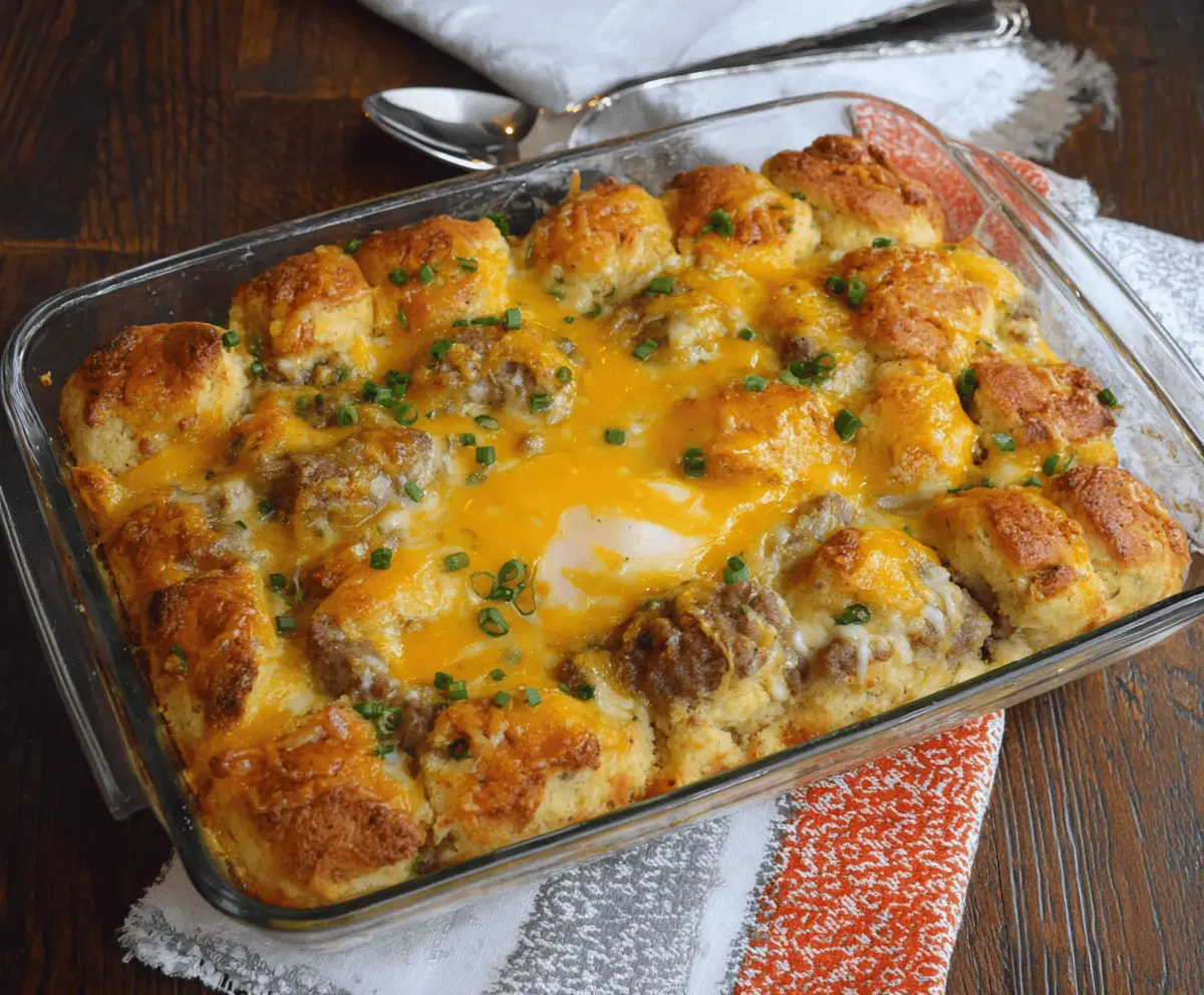 This Biscuits and Gravy Breakfast Casserole is a tasty way to start your day! Soft biscuits soak up a creamy sausage gravy, making each bite delicious and comforting.