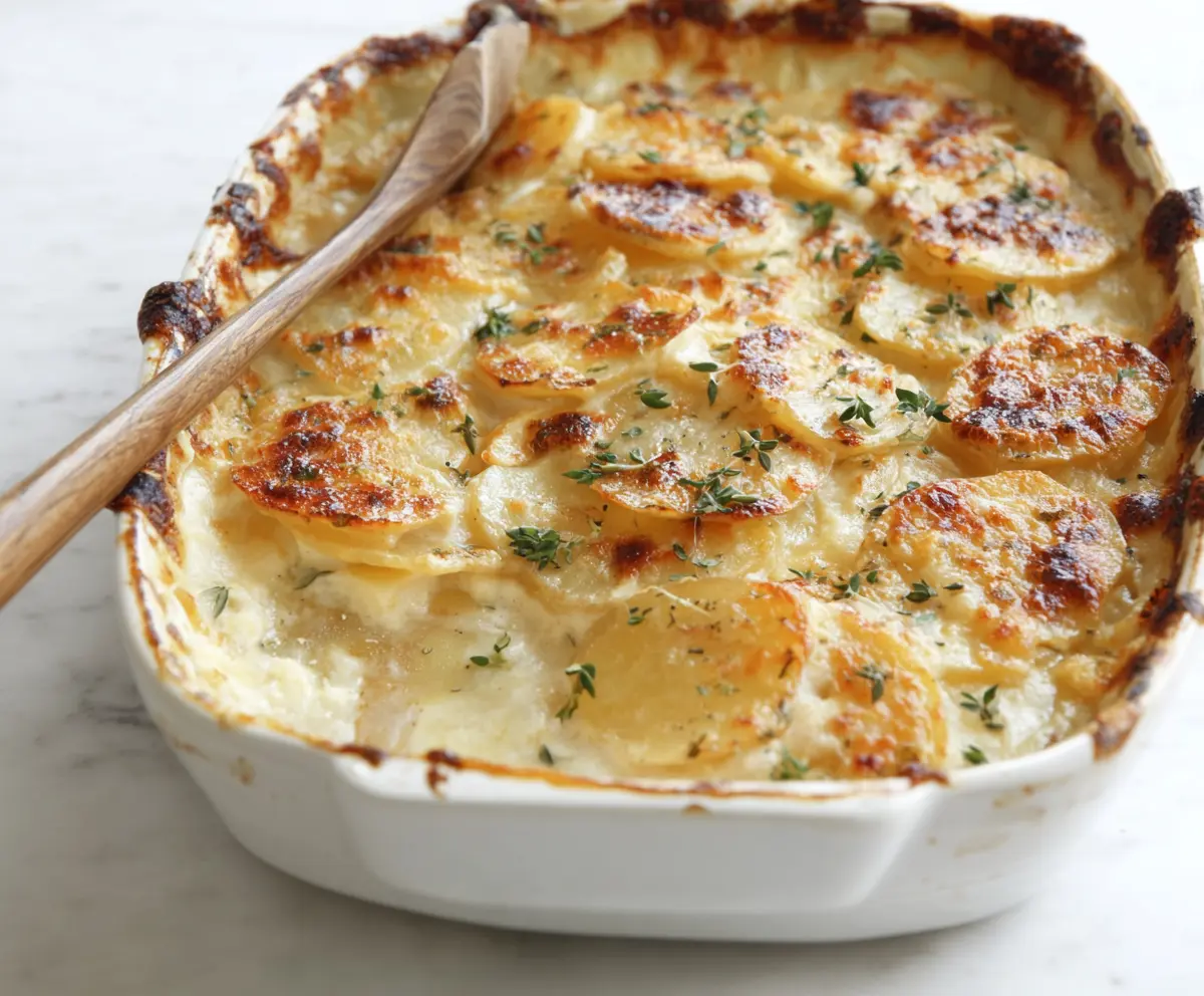 Let your scalloped potatoes sit for about 10 minutes before serving. This resting time helps set the sauce a bit. Garnish with extra fresh thyme leaves for a lovely touch before digging in!