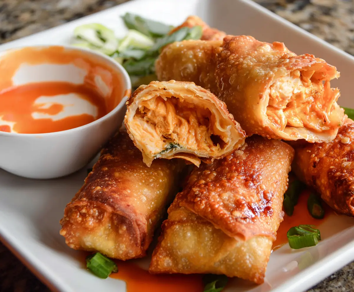Transfer the egg rolls to a serving plate, sprinkle with chopped green onions, and serve hot with ranch or blue cheese dressing on the side for dipping. Enjoy your spicy, cheesy, and crunchy Buffalo Chicken Egg Rolls!