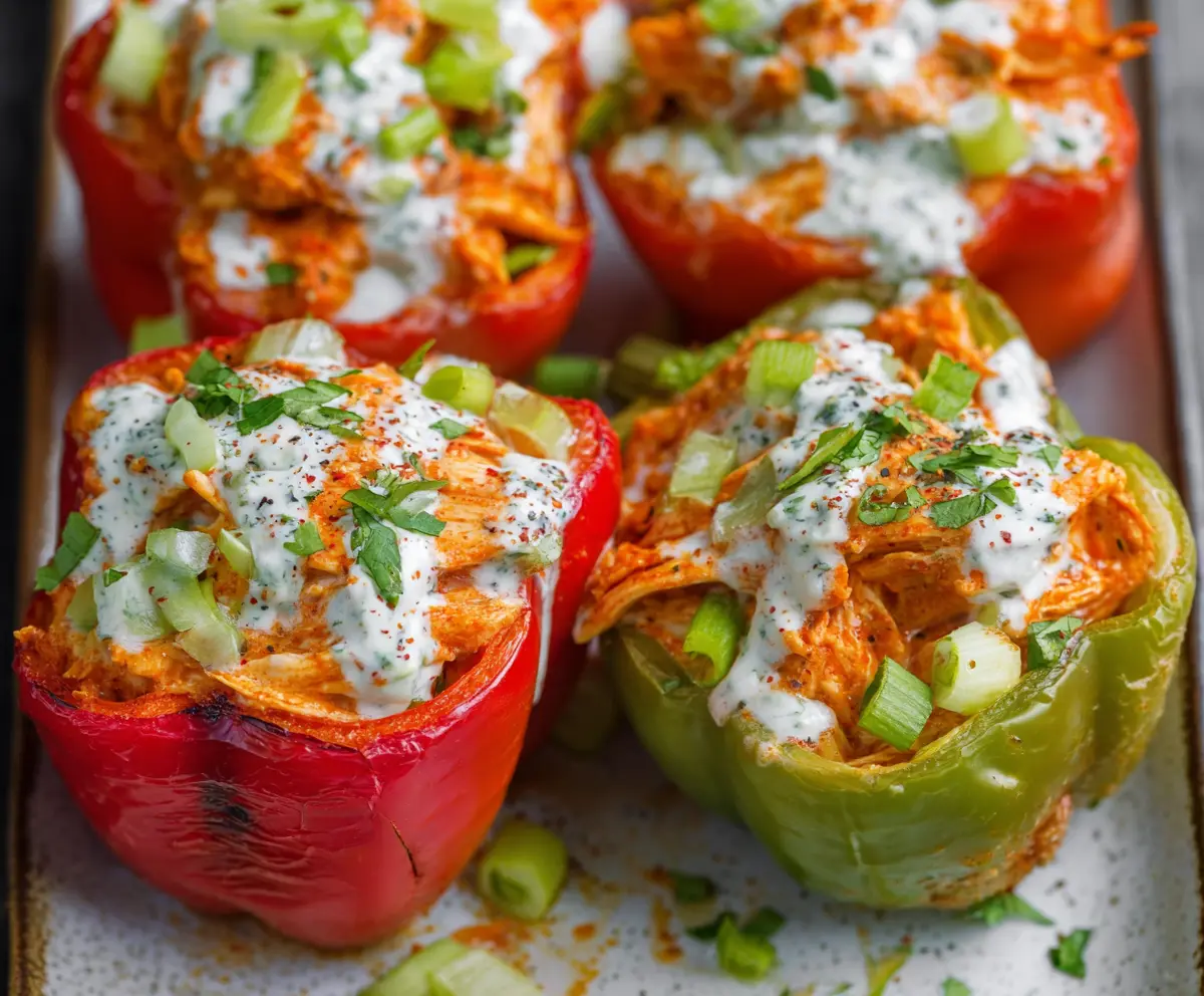 Buffalo Chicken Stuffed Peppers are a tasty treat! These colorful peppers are filled with spicy buffalo chicken, cream cheese, and topped with cheesy goodness. Perfect for a fun meal!