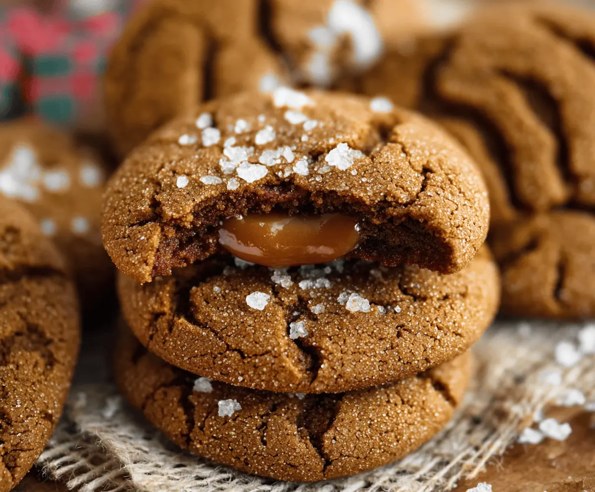 Delicious caramel-stuffed gingerbread cookies with a golden-brown exterior and gooey caramel filling