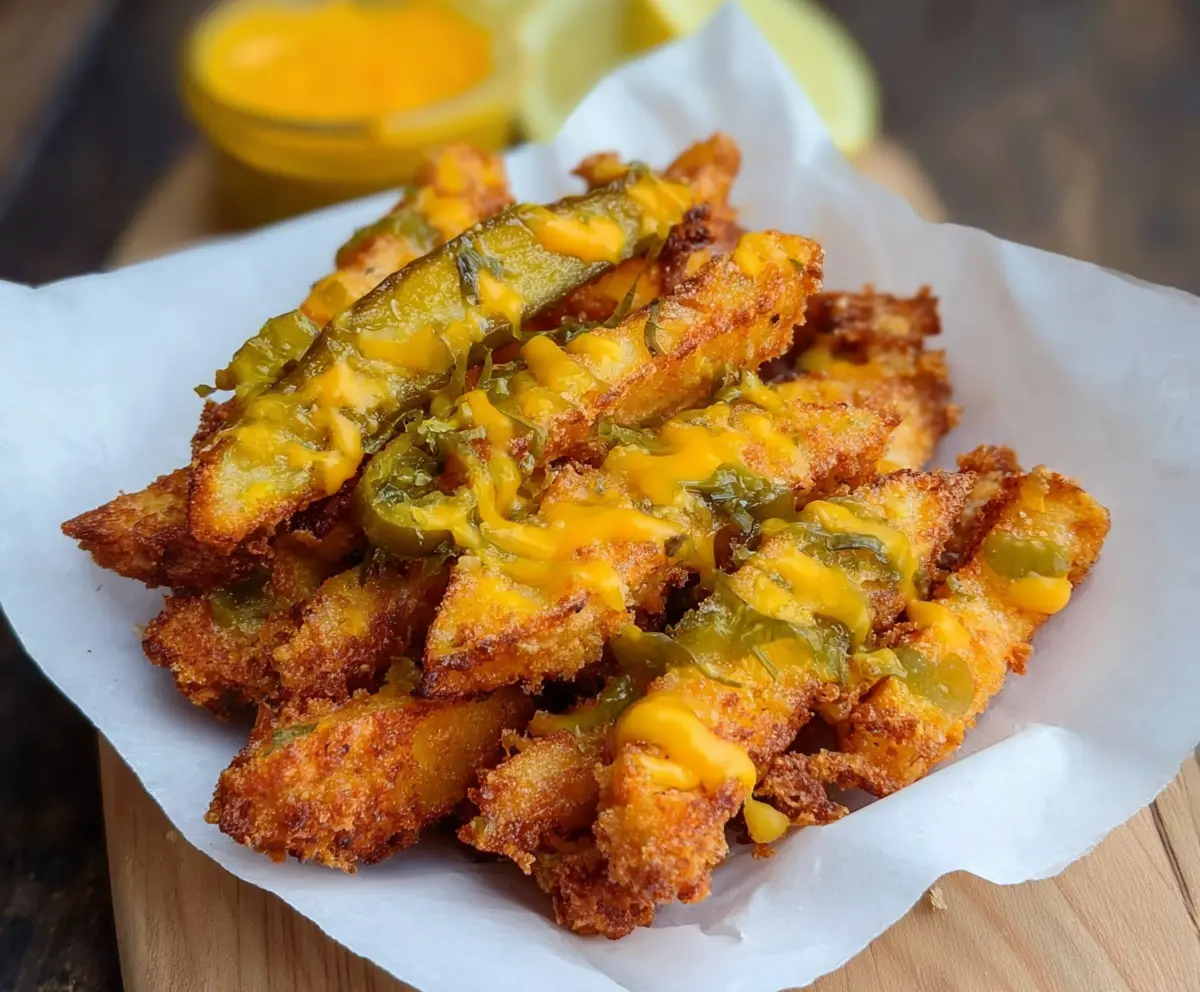 Get ready for a fun twist on fries with these Cheddar Pickle Fries! Crispy, golden fries are topped with gooey cheddar cheese and tangy pickles for an amazing flavor combo.