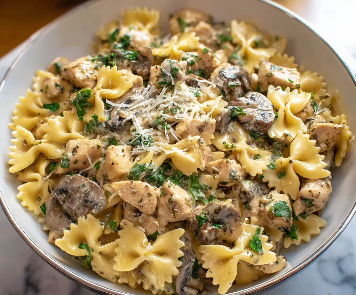 Delicious chicken and mushroom pasta served on a white plate, showcasing creamy sauce and fresh herbs.