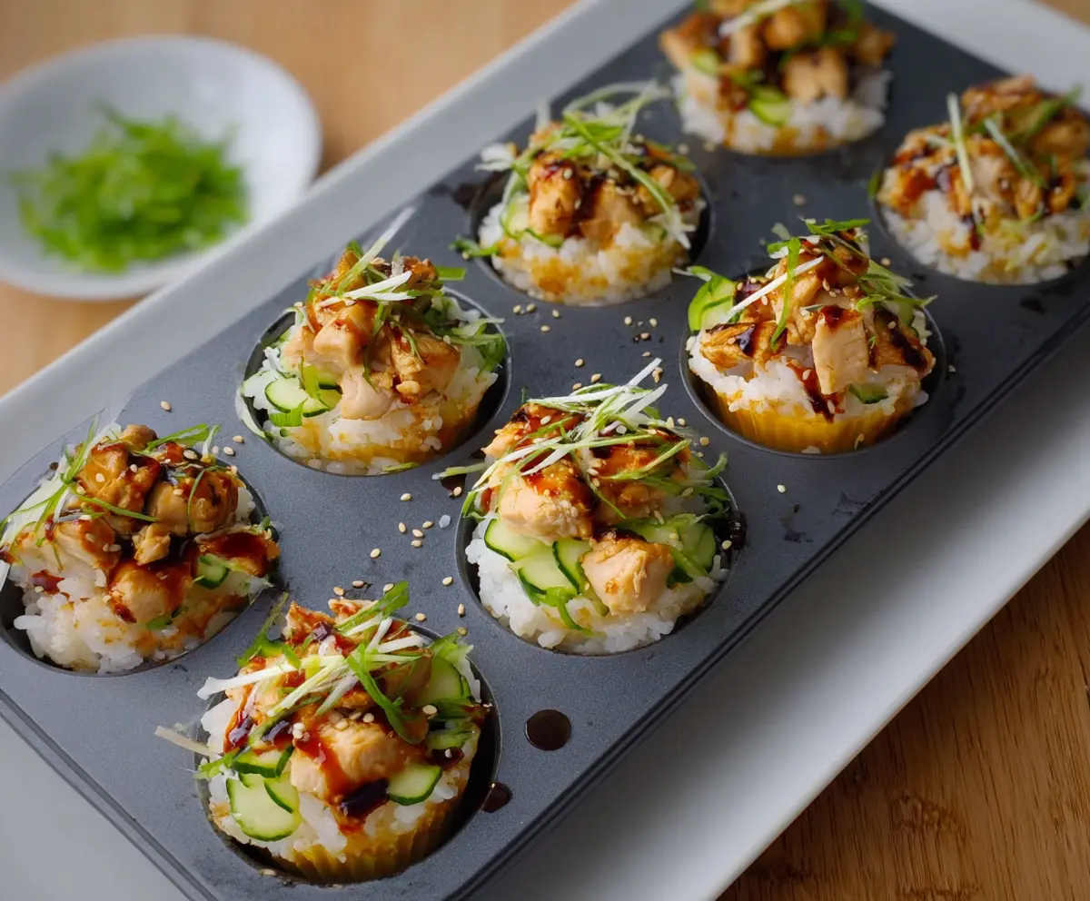 Delicious chicken sushi cups with fresh vegetables and rice, perfect for appetizer or light meal