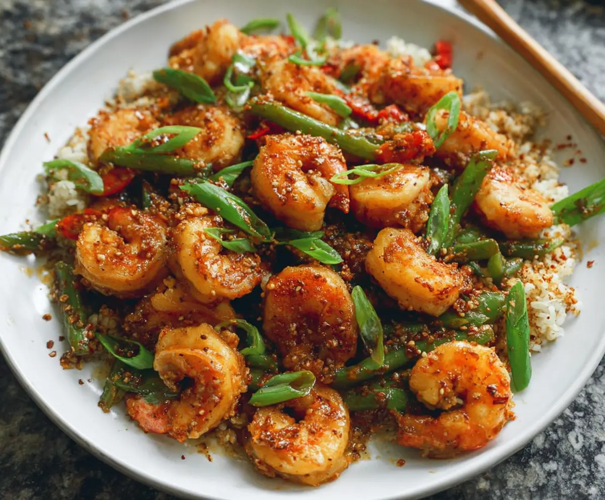 Return the green beans to the wok and toss everything together. Then, add the cornstarch slurry to thicken the sauce. Keep stirring until the sauce coats the shrimp and vegetables nicely. Taste and adjust with more salt and pepper if needed.