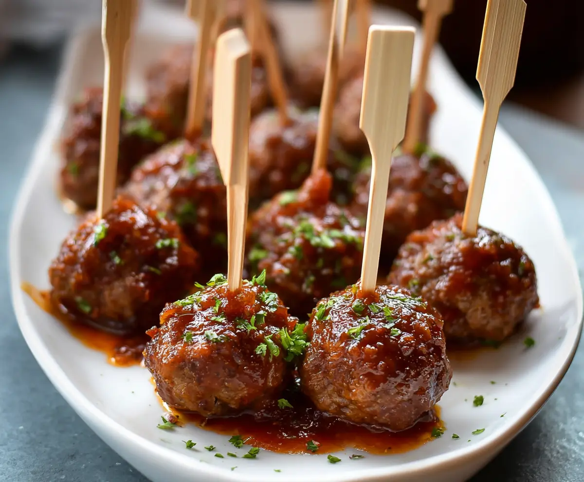 Arrange the saucy meatballs on a serving platter. Insert toothpicks or small skewers into each meatball for easy serving. If you’d like, you can garnish with fresh rosemary or some chopped parsley for a bit of color and presentation.