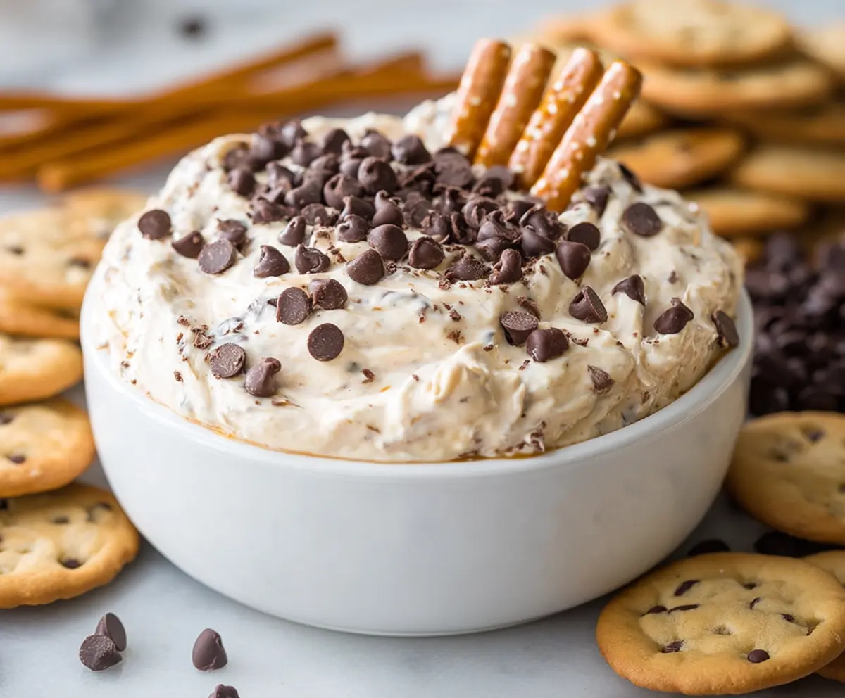 In addition to standard chocolate chip cookies, you can serve the dip with pretzel sticks, fruit slices (like apples or bananas), graham crackers, or even marshmallows for a fun twist!