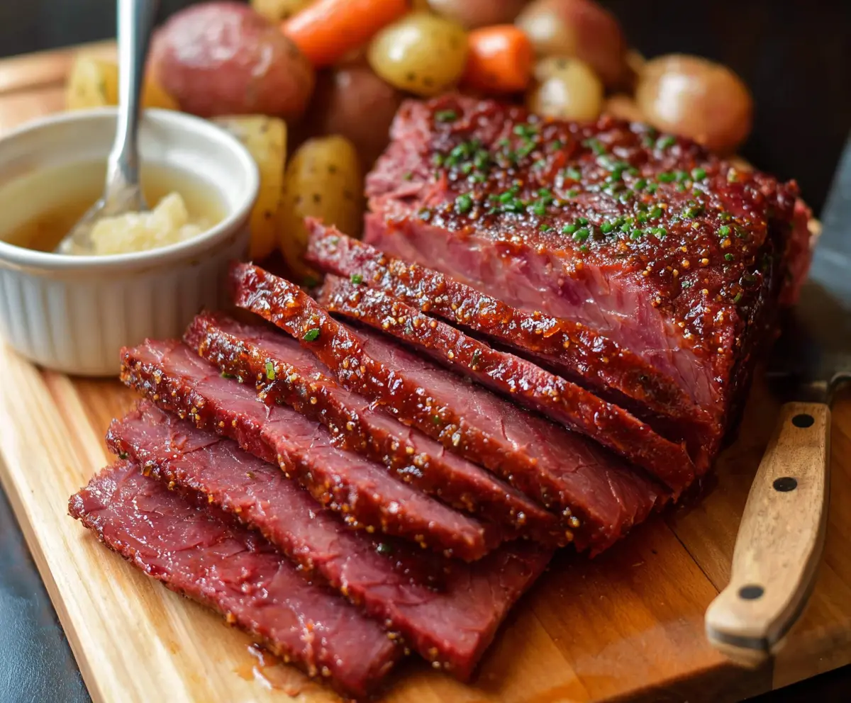 Once done, transfer the glazed corned beef slices to a serving platter. Drizzle any leftover glaze from the dish over the meat for extra flavor. If you’d like, sprinkle some freshly chopped chives or parsley on top for a pop of color and fresh taste!