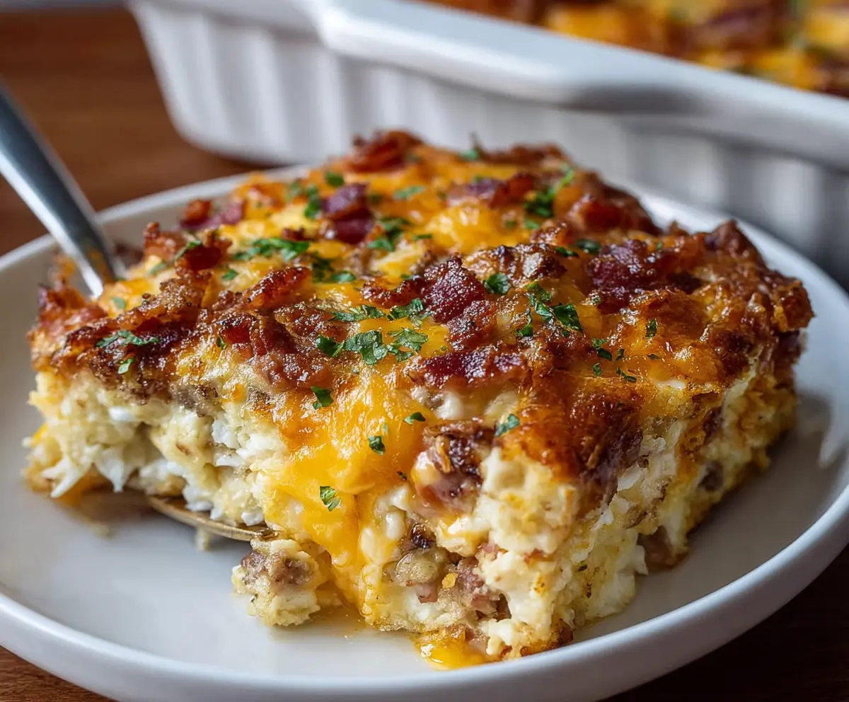 This casserole is not just a crowd-pleaser; it’s packed with savory sausage, creamy eggs, crispy bacon, and lots of cheesy goodness. Dig in and enjoy!