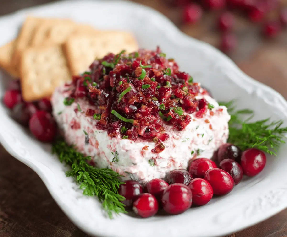 Transfer the mixture to a serving dish. You can shape it into a mound or just spread it out for a rustic look. For added presentation, top your dip with a spoonful of reserved chopped cranberries and a few sprigs of fresh dill.