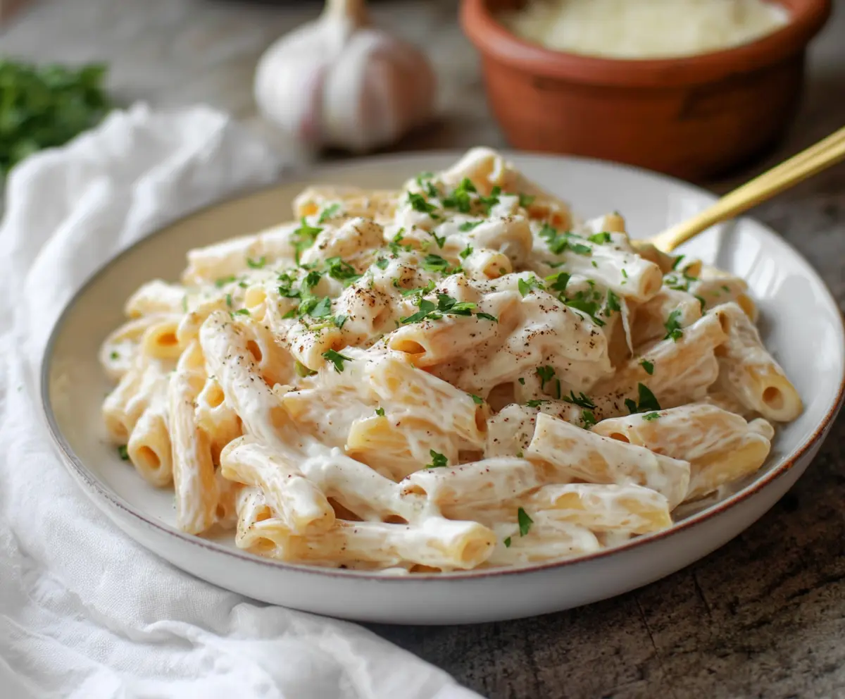 Creamy Cottage Cheese Alfredo Sauce with Penne Pasta and Chicken