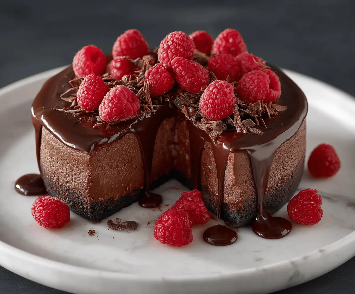 Once the cheesecake is completely chilled, pour the ganache over the top, allowing it to drip slightly over the sides for a beautiful presentation. Top with fresh raspberries and sprinkle with dark chocolate shavings or curls for that extra touch. Slice, serve chilled, and enjoy your delicious Dark Chocolate Raspberry Cheesecake!