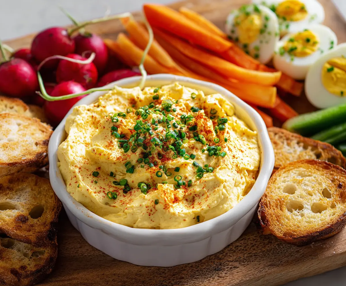 Transfer the creamy yolk mixture to a nice serving bowl, smoothing the surface. Sprinkle the top with paprika and chopped chives or green onions for a pop of color. Now, lay out those toasted baguette slices, crackers, and fresh veggie sticks on a platter and serve your delicious deviled eggs dip. Everyone will love it!