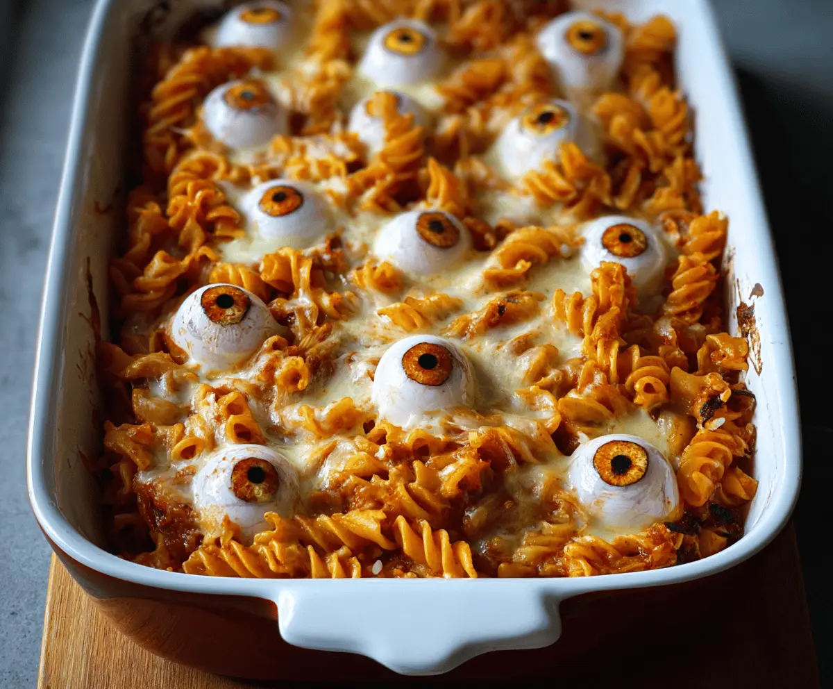 Store leftover Eyeball Pasta Bake in an airtight container in the refrigerator for up to 3 days. Reheat gently in the microwave or oven, adding a splash of marinara sauce if needed to keep it moist.