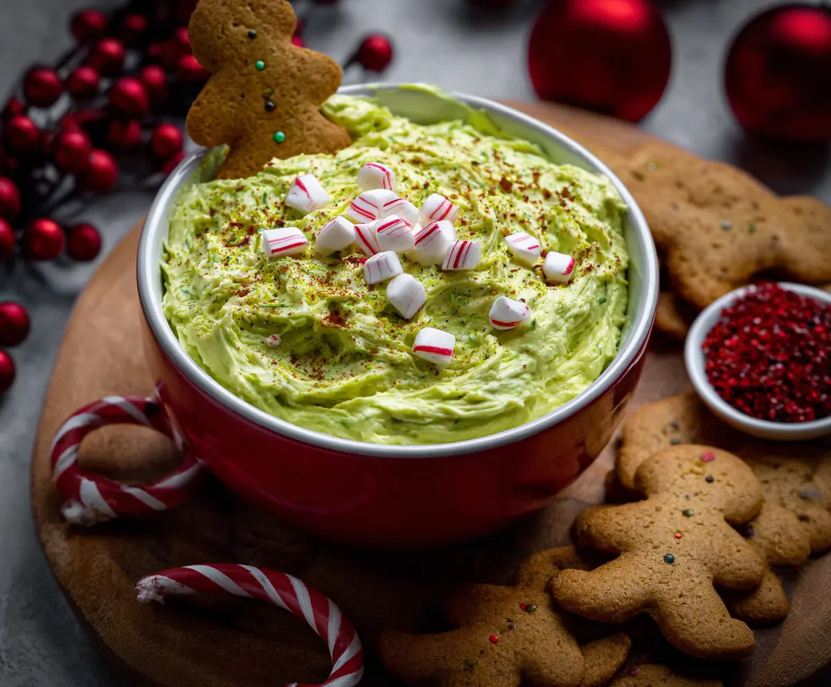 Festive Grinch Dip with green and red toppings served in a decorative bowl for holiday party.