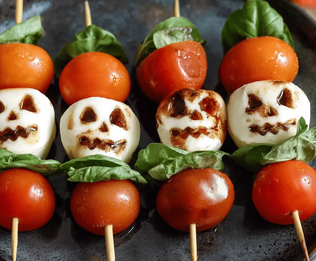 These Halloween Caprese skewers are a fun and spooky twist on the classic appetizer! They are made with fresh mozzarella balls, cherry tomatoes, and basil, all on skewers, just like little Halloween treats!