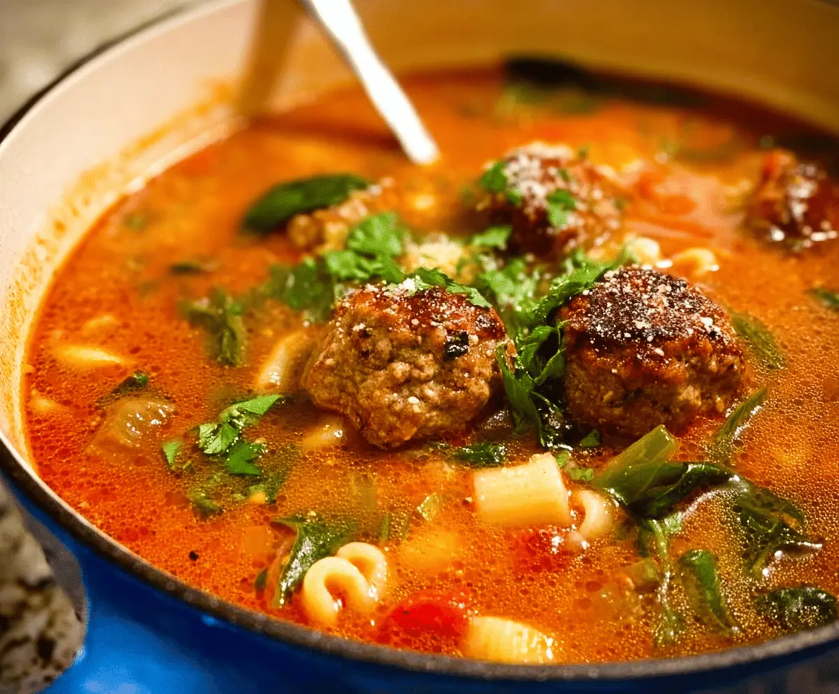A bowl of hearty Italian Meatball Soup featuring tender meatballs, chopped vegetables, and fresh herbs in a flavorful tomato broth.