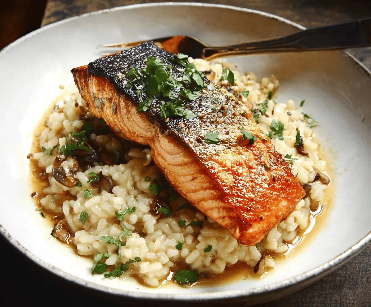 This Japanese-style risotto beautifully merges traditional Japanese ingredients like dashi, mirin, and soy sauce with the creamy texture of risotto, elevated with the rich seared salmon and earthy mushrooms. Perfect for a cozy dinner at home!