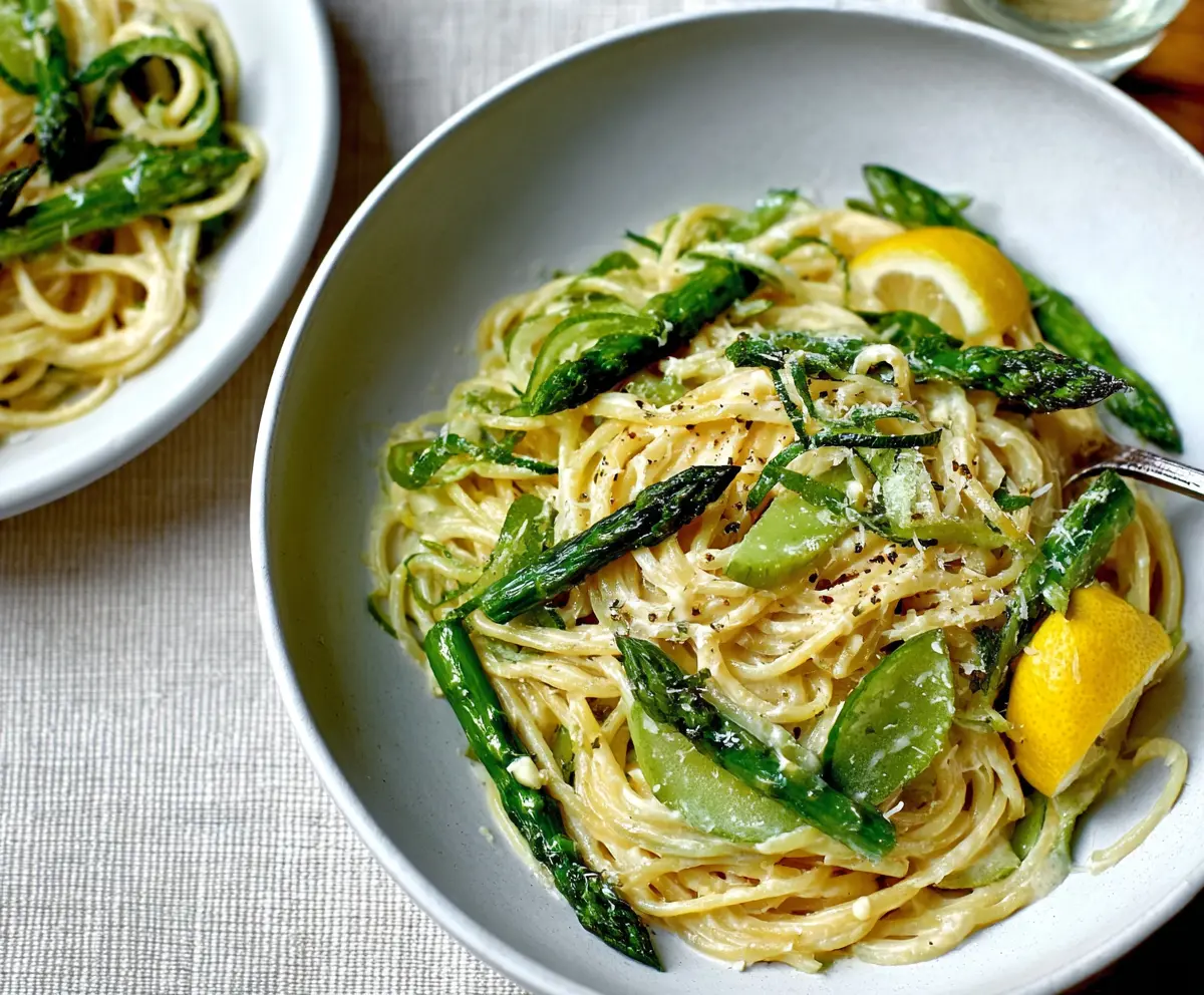 Creamy lemon asparagus pasta dish served with fresh herbs and grated cheese.