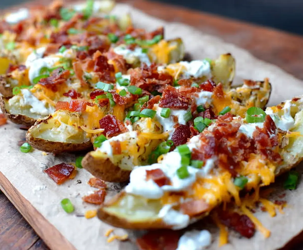 These Loaded Baked Potato Wedges are crispy on the outside and fluffy on the inside, topped with melted cheese, crispy bacon, and fresh green onions. It’s like a hug for your taste buds!