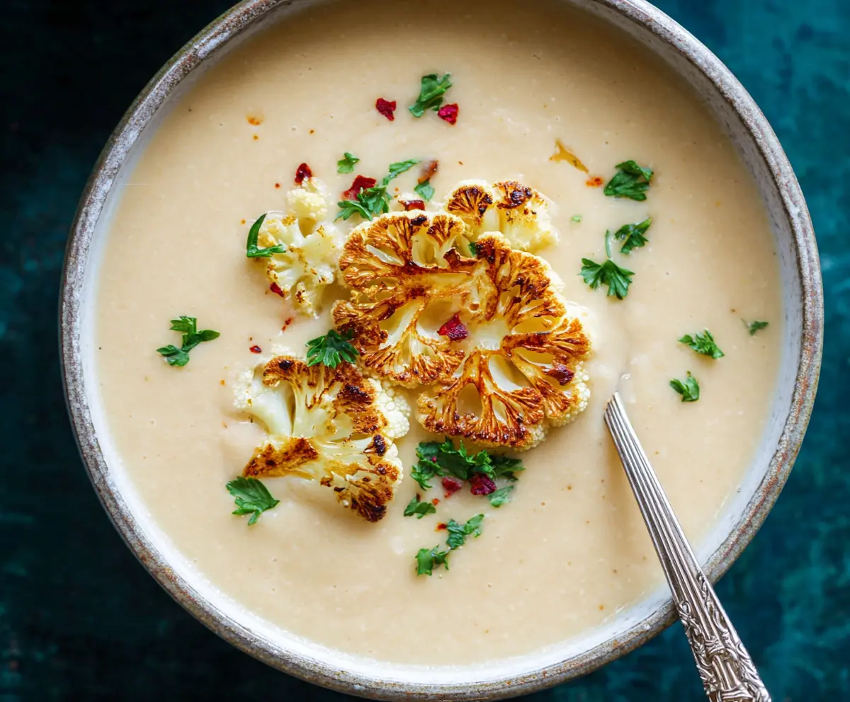 Start by preheating your oven to 425°F (220°C). Take the reserved cauliflower florets and toss them with 1 tablespoon of olive oil, along with some salt and pepper. Spread these on a baking sheet and pop them in the oven for about 20-25 minutes. Turn them once during roasting until they’re golden and slightly charred. This adds great flavor for your garnish!