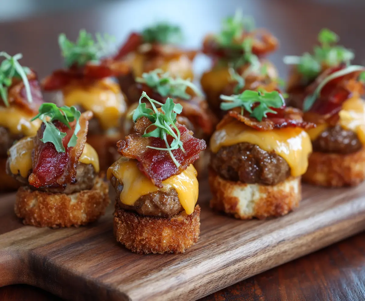 Mini bacon cheeseburger bites served on a platter, showcasing savory mini burgers with bacon and melted cheese.