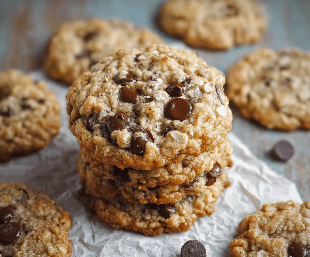 Enjoy these delightful cookies that are packed with chocolate and chewy oats—just like the image!