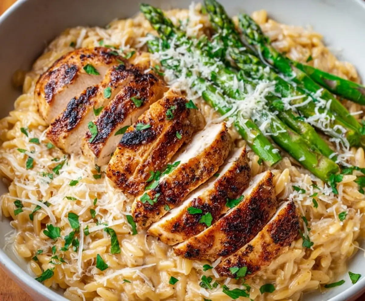 This creamy Parmesan orzo with tender chicken and fresh asparagus is a winner! It’s a cozy one-pot dish that’s easy to whip up and tastes like a hug on a plate.