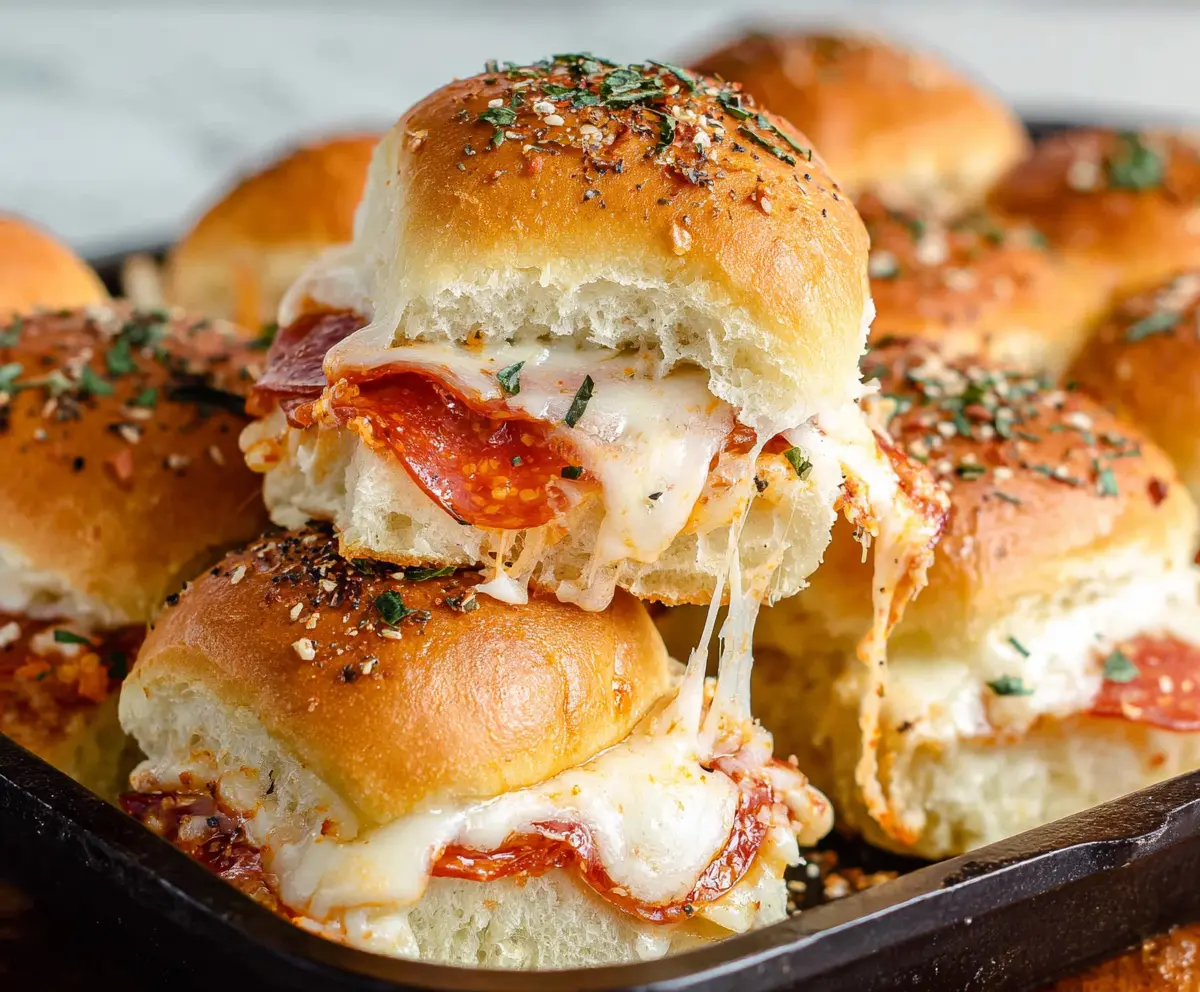 These Pepperoni Pizza Sliders are mini sandwiches filled with gooey cheese and spicy pepperoni, all nestled between soft hamburger buns. Perfect for game day or a fun family meal!