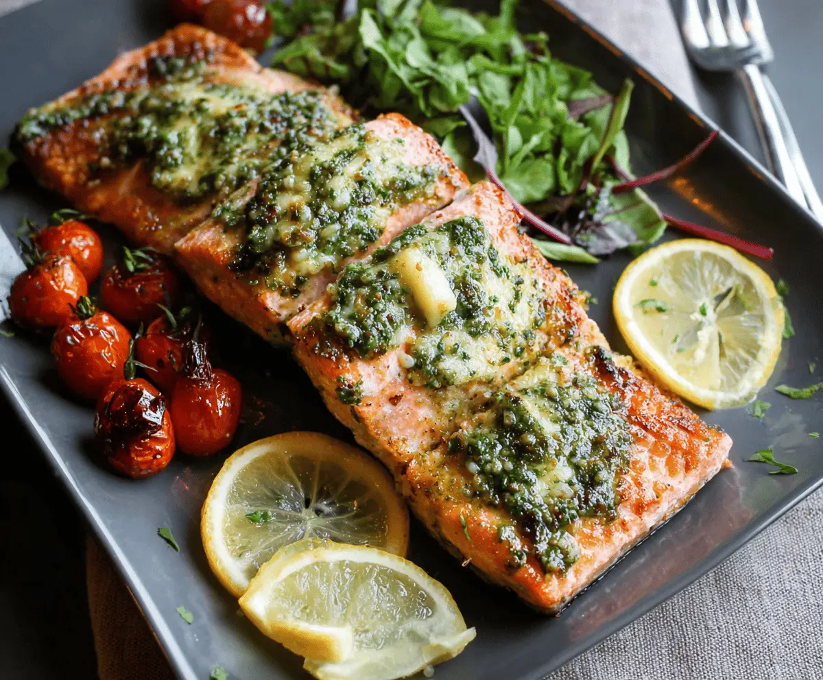Delicious Pesto Butter Salmon cooked to perfection, featuring a vibrant green pesto topping and tender flaky fish.