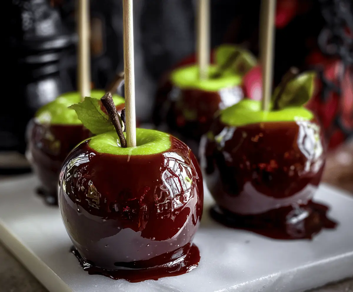 Once set, serve your Poison Apple Caramel Apples on sticks, and watch as everyone admires (and enjoys) your spooky creations!