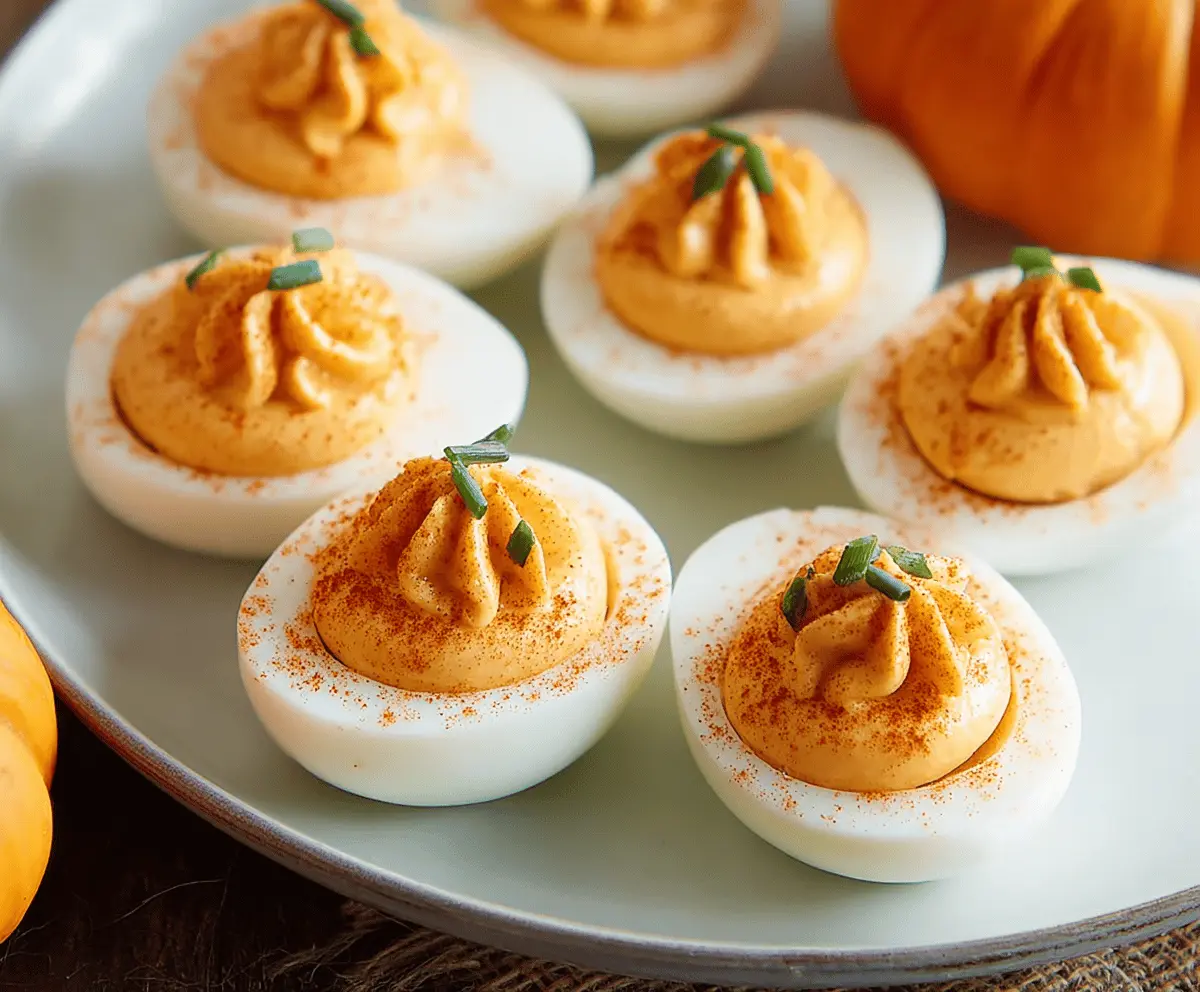Delicious pumpkin deviled eggs garnished with paprika on a festive plate