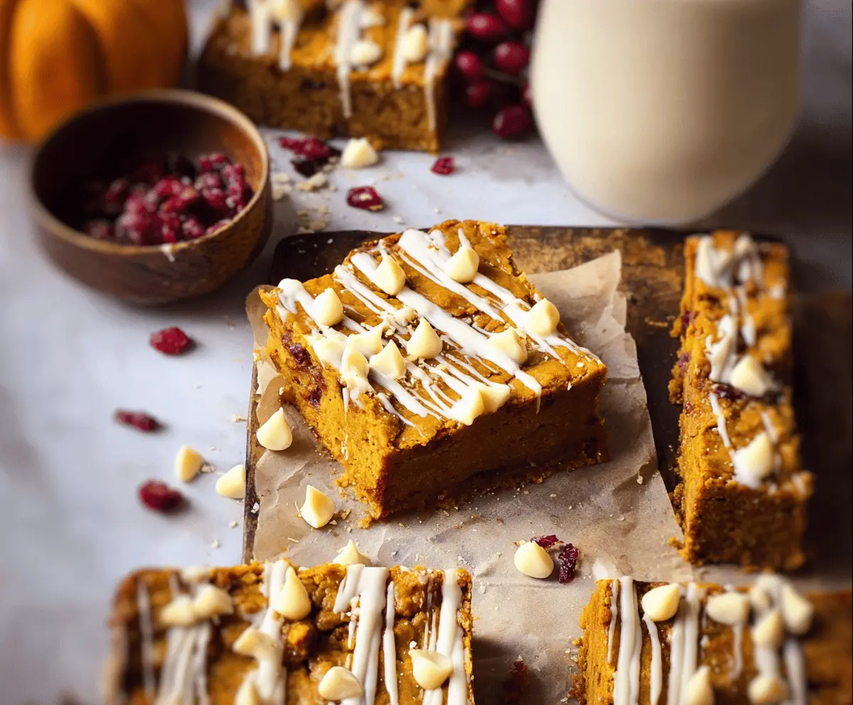 These Pumpkin Spiced Bars are a cozy treat that mixes the warm flavors of pumpkin, cinnamon, and nutmeg with sweet white chocolate. Perfect for autumn gatherings!