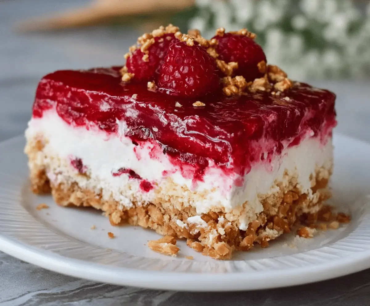 This Raspberry Pretzel Salad Cake is a fun and tasty treat! It has a crunchy pretzel crust, a creamy layer, and a sweet raspberry topping. It’s a mix of flavors that everyone will love!