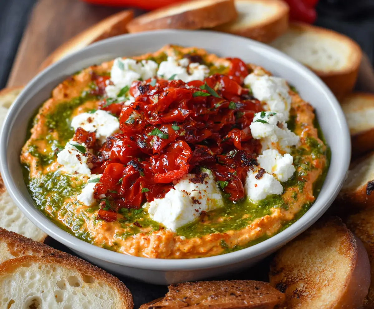 This Roasted Red Pepper Goat Cheese Pesto Dip is a creamy and colorful treat! With zesty roasted red peppers and tangy goat cheese mixed in, it’s packed with flavor.