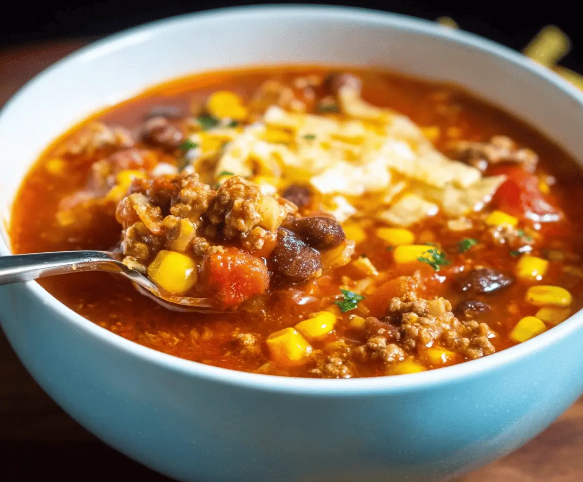 This flavorful and comforting soup packs a spicy kick from the Rotel that blends wonderfully with the hearty beans, corn, and taco-seasoned ground beef. Perfect served with a side of tortilla chips or warm cornbread!