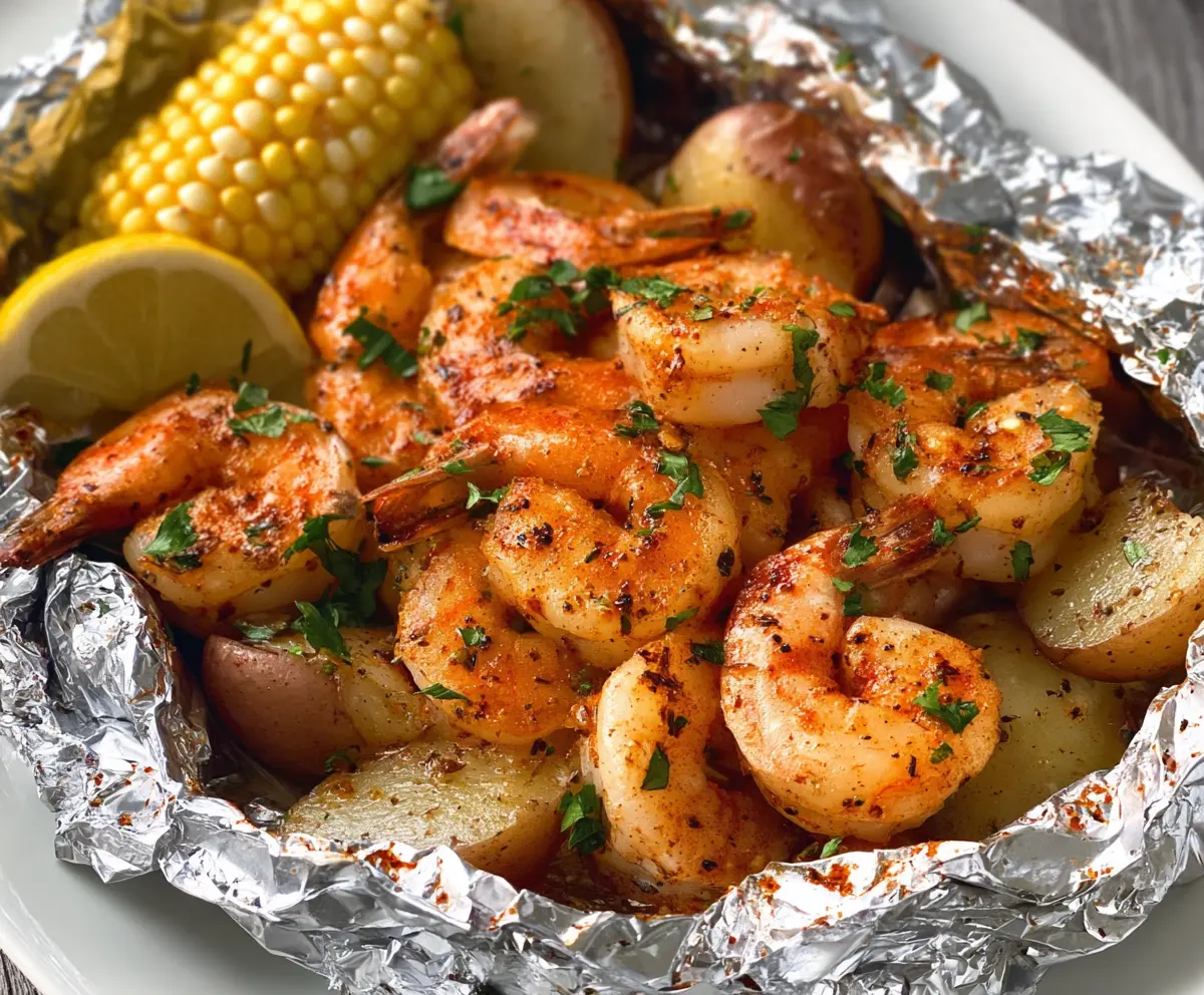 Place the foil packet on a baking sheet and bake it in the preheated oven for 20-25 minutes. The shrimp will turn pink, and the potatoes should be tender.