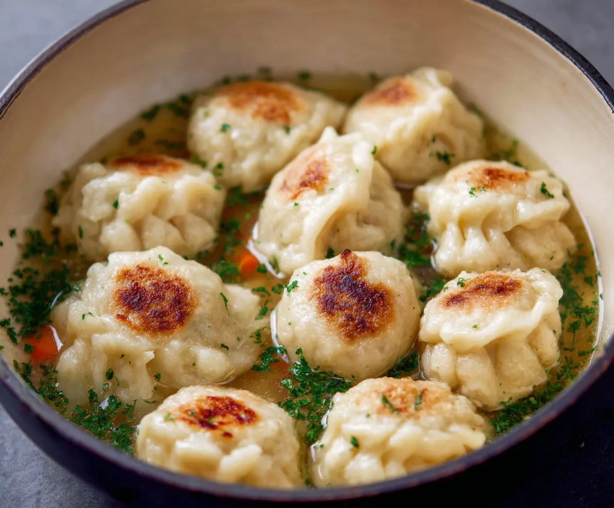 - After cooking in the skillet for 2-3 minutes until golden, carefully move them to a pot of simmering broth. The broth creates moisture, which is essential for fluffy dumplings.