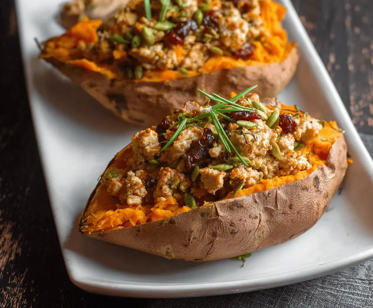 Stuffed sweet potatoes with turkey make a warm and filling meal. The sweet potatoes are fluffy and sweet, while the seasoned turkey adds a tasty twist!