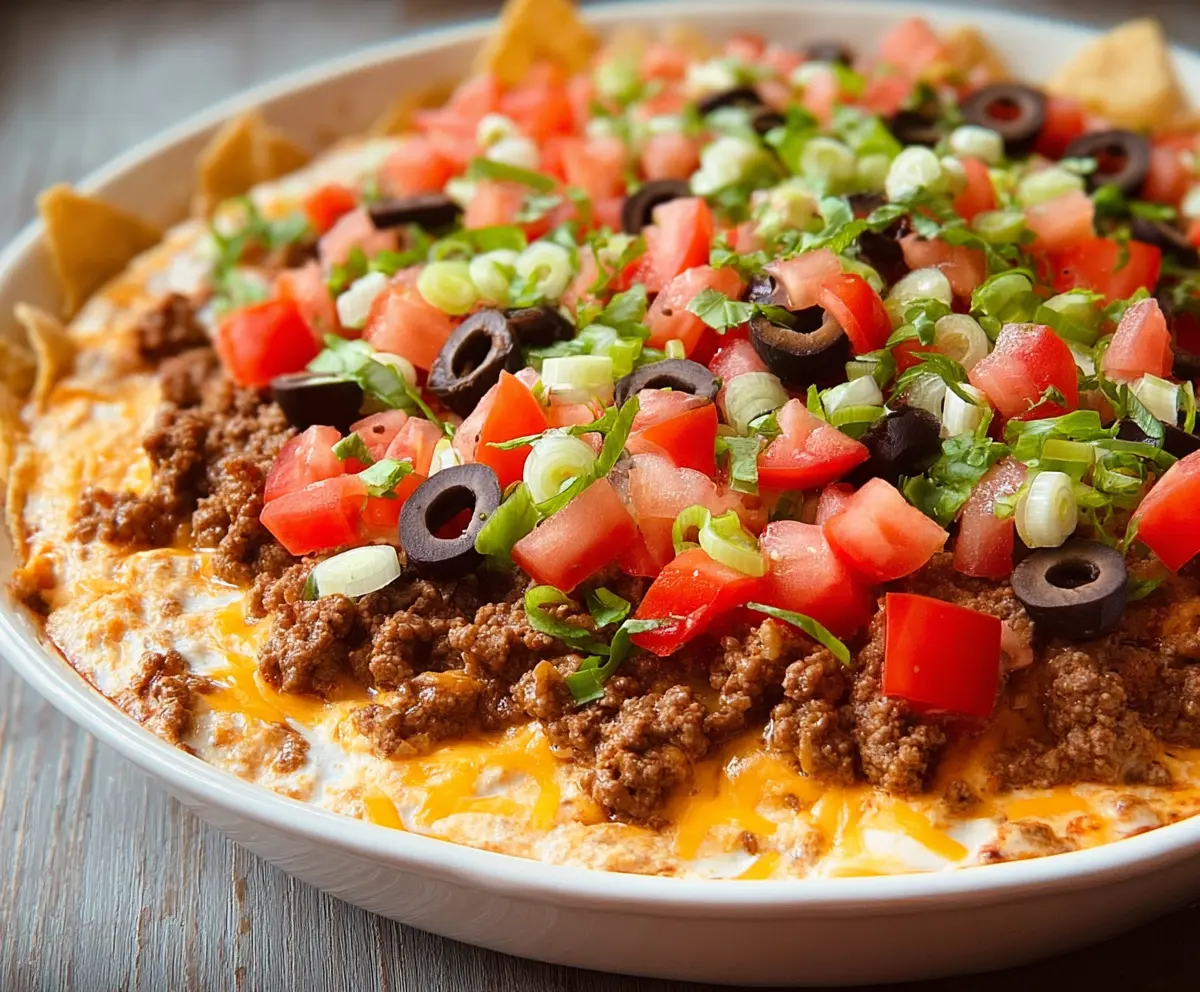 This Taco Dip with Ground Beef is a fun and tasty treat! It’s made with seasoned ground beef, creamy cheese, and fresh toppings like tomatoes and olives—perfect for any gathering.