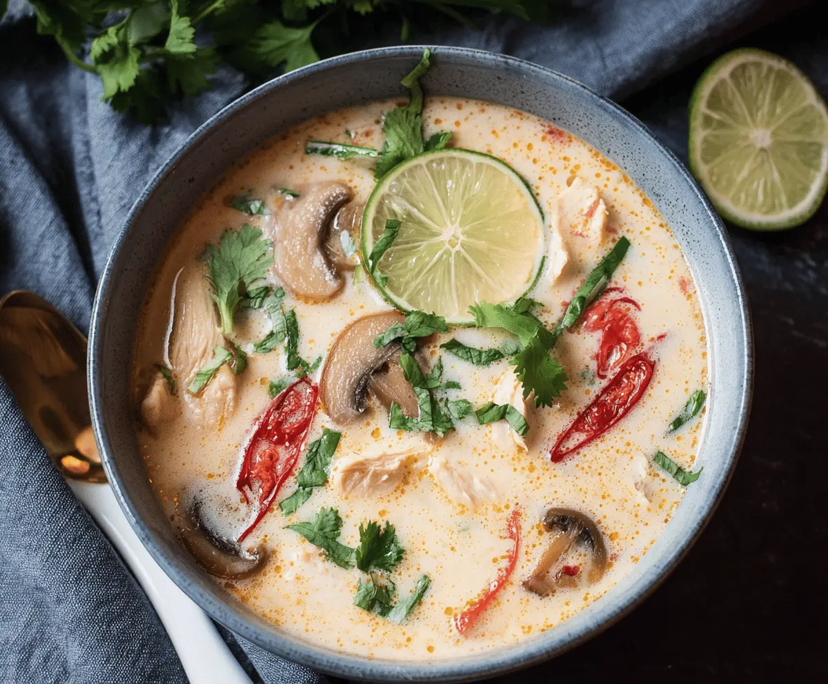 Creamy Thai Coconut Chicken Soup (Tom Kha Gai) with tender chicken, fresh herbs, and aromatic coconut milk in a flavorful bowl