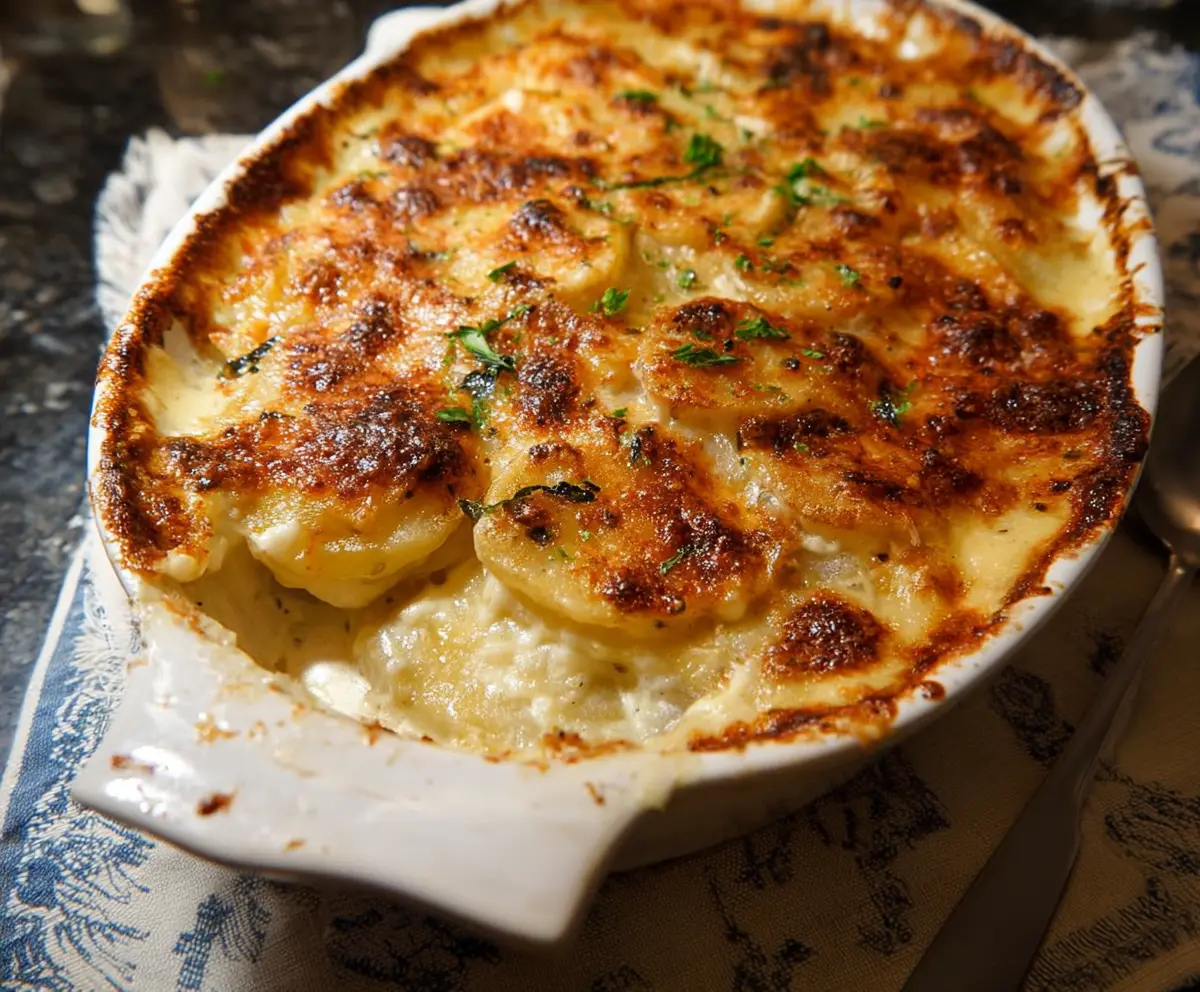Once removed from the oven, let your scalloped potatoes cool for about 5-10 minutes. This helps everything firm up a little. Then, garnish with freshly chopped parsley before serving. Enjoy this creamy, cheesy treat!