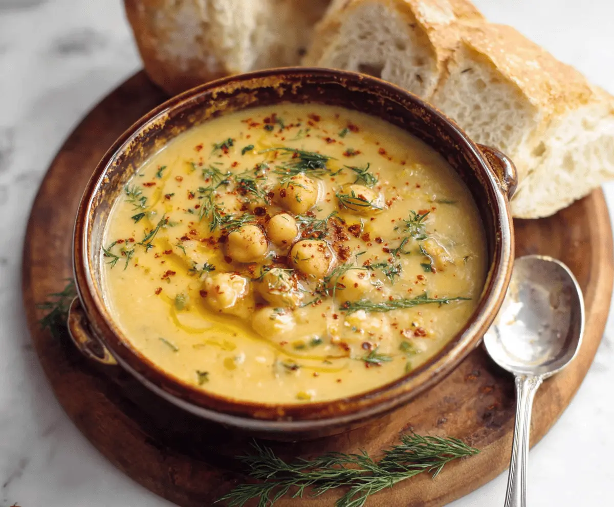 Creamy vegan garlic chickpea soup garnished with fresh herbs in a bowl, served with bread on a rustic table.