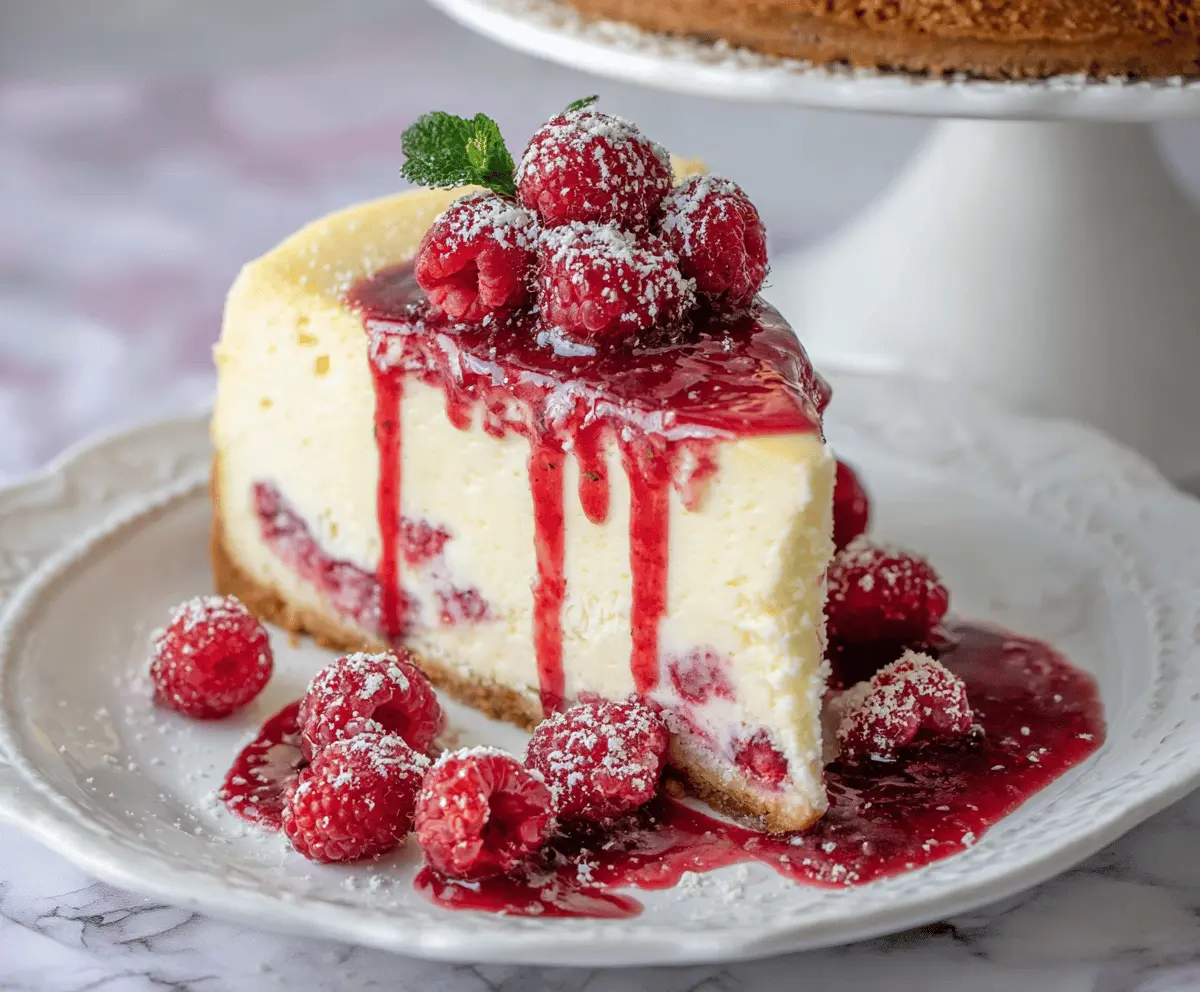 Before serving, beautify your cheesecake with fresh raspberries on top. Dust with powdered sugar and add mint leaves for a lovely finishing touch if desired.