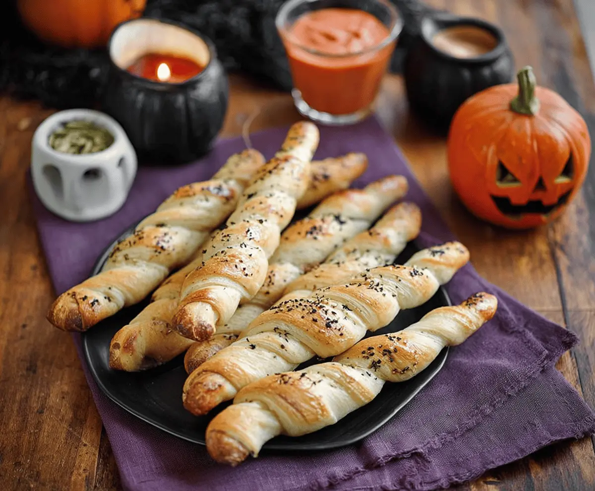 These Witch Finger Breadsticks are a fun and spooky treat! They’re made with simple breadstick dough and shaped into creepy fingers, complete with almond “nails.” Perfect for Halloween! 🎃